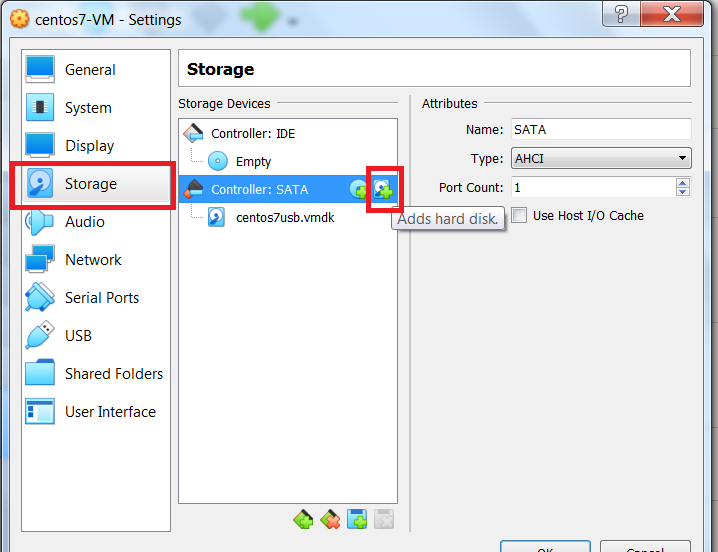 In the Settings window, ensure the Storage tab is selected. Then, click the Adds hard disk button on Controller: SATA