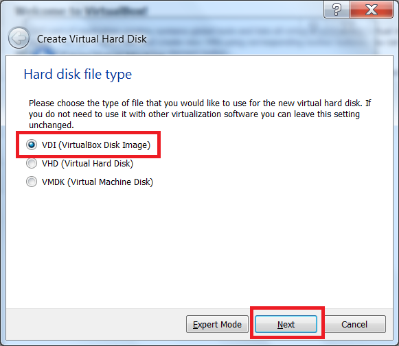 Now, you will have to choose the type of virtual hard disk. Select VDI and click Next