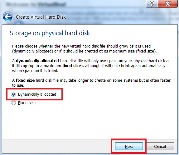 We can now choose whether the virtual hard disk takes up the size we allocate as needed (Dynamically allocated) or immediately (Fixed). To save space on my host system, I will be choosing Dynamically allocated and clicking Next