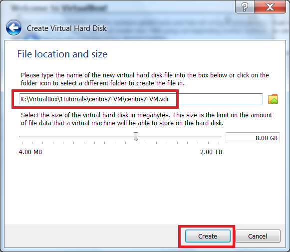 Note the recommended size (8 GB) of a virtual hard disk for CentOS 7. Click Create