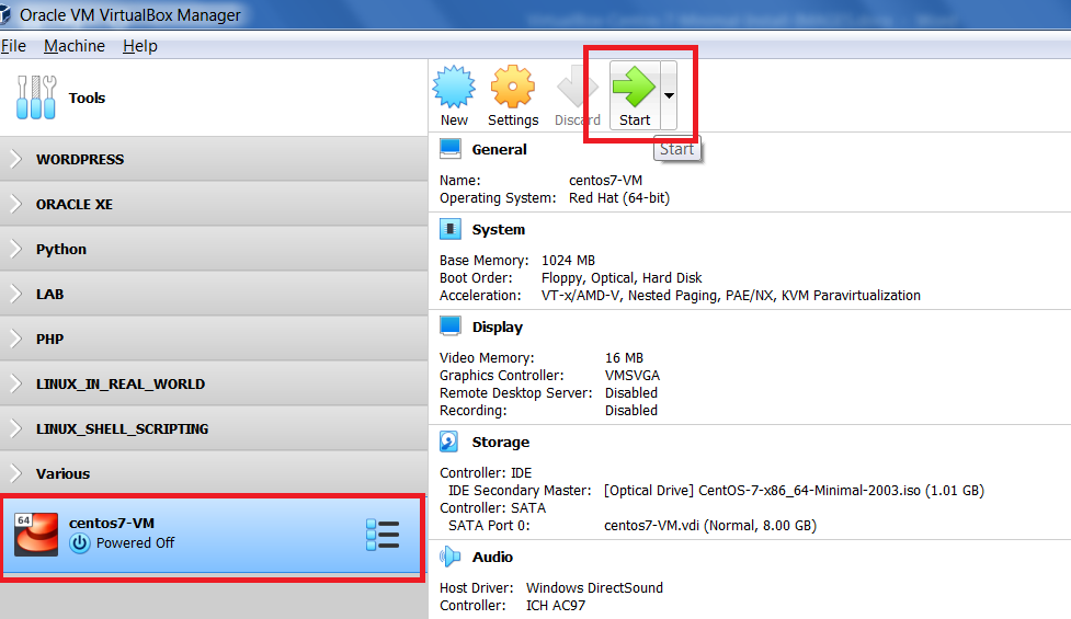 On the VirtualBox Manager Interface, ensure your new VM is selected and click Start