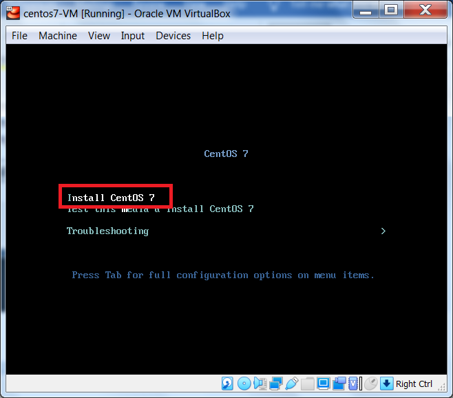 Next, navigate up to Install Cent0S 7 and, on your physical keyboard, hit the Enter key to begin the installation.