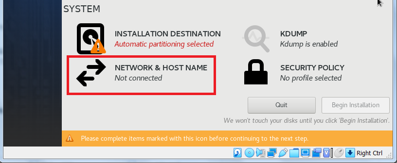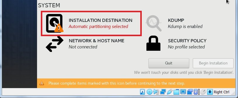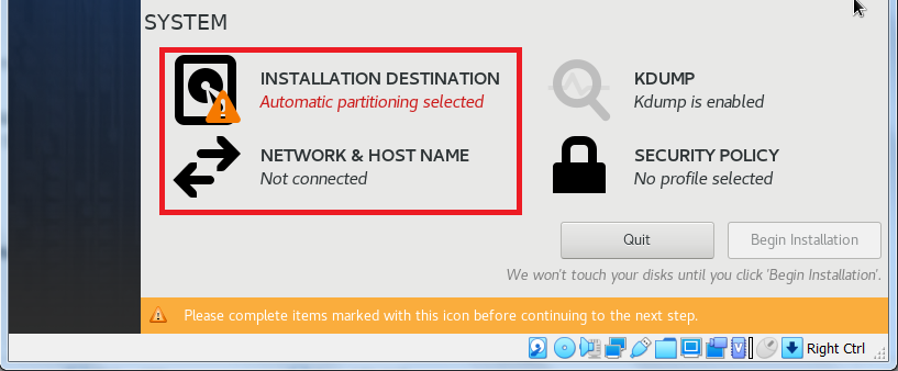 On the Installation Summary page, we need to configure a few settings before we can begin the installation.