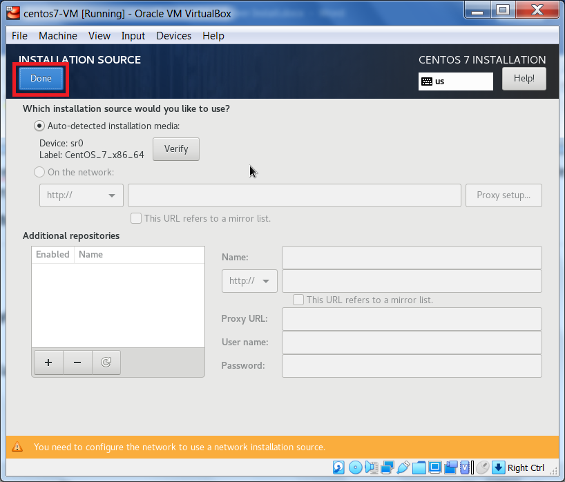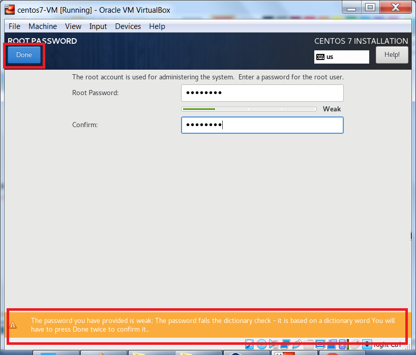 Enter the root user’s password and click Done. Notice the warning message at the bottom of the screen.