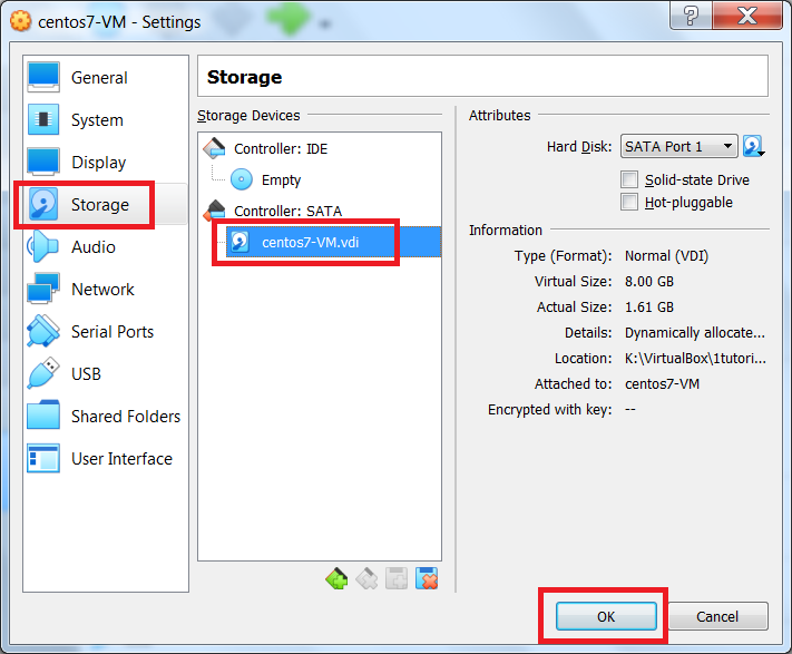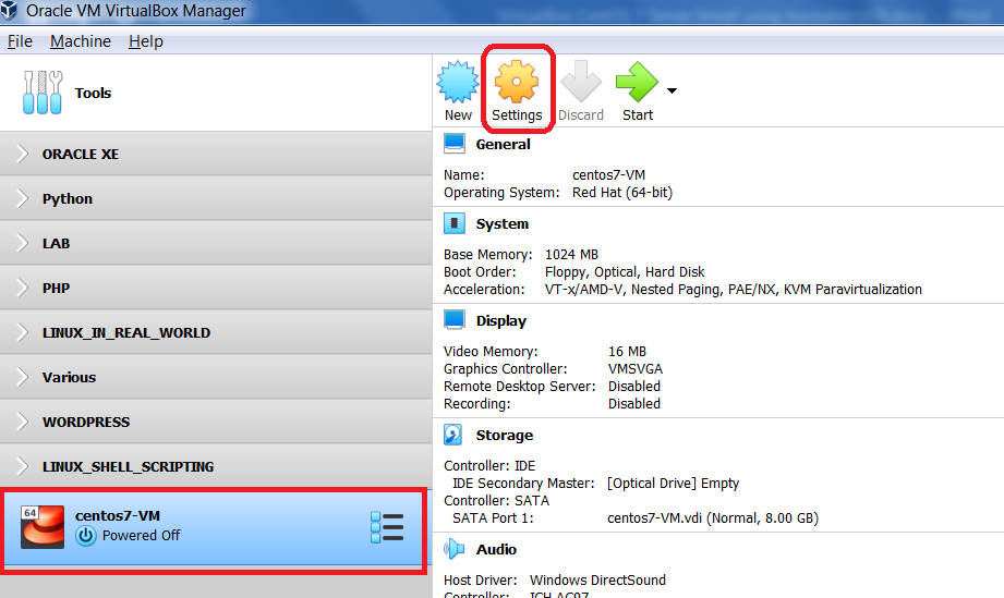 Now we will need to add a virtual hard disk to act as our CentOS 7 installation location. To create a new virtual hard disk, from the VirtualBox Manager, ensure your VM is selected and click Settings