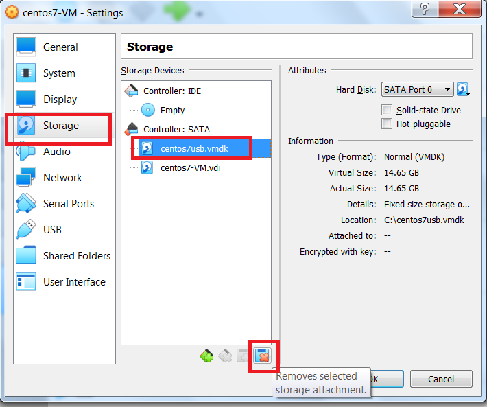 Please note that, under Controller: SATA, the .vmdk file (centos7usb.vmdk) pointing to the bootable USB MUST be first in the list, followed by the virtual hard disk (centos7-VM.vdi) being used as the CentOS 7 install location.