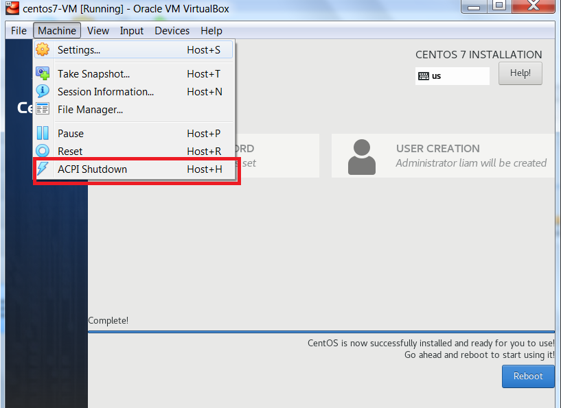 Now from the Machine menu item, click ACPI Shutdown to stop the VM.