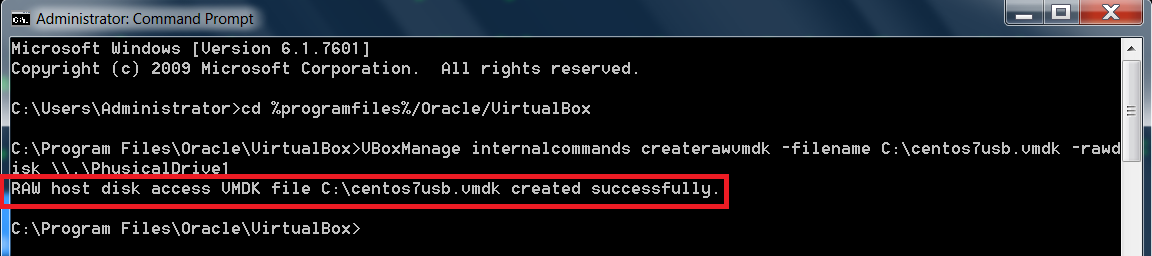 VBoxManage internalcommands createrawvmdk -filename C:\centos7usb.vmdk -rawdisk \\.\PhysicalDrive1