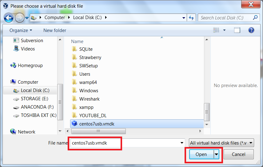 (in my case, C:\centos7usb.vmdk), select it and click Open