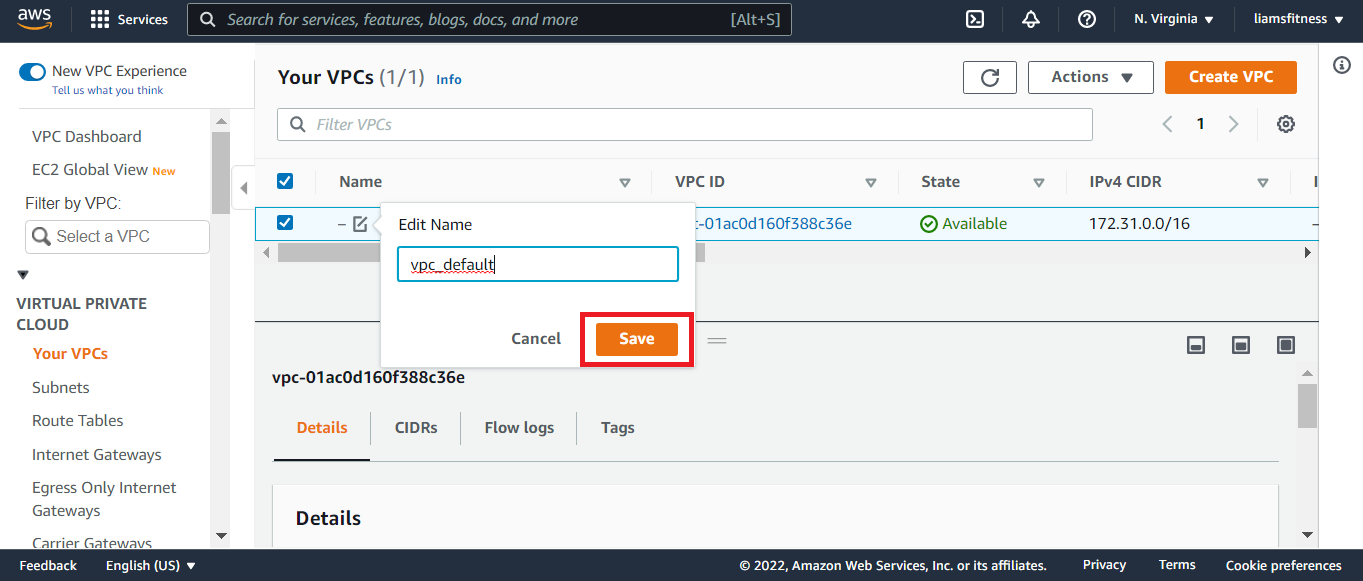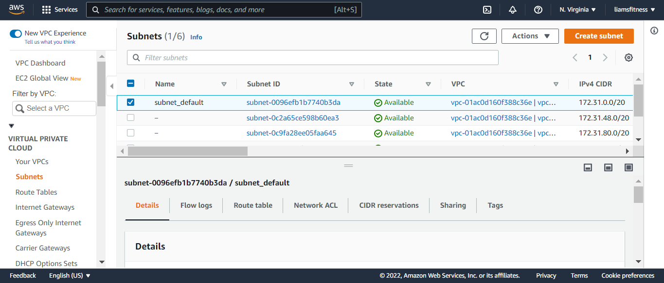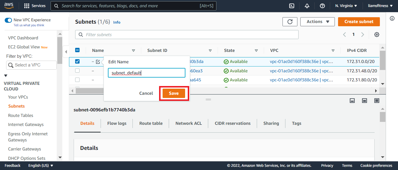 Set the name of the first subnet to subnet_default and click save Also note that the CIDR IPv4 subnet is 172.31.0.0/20.