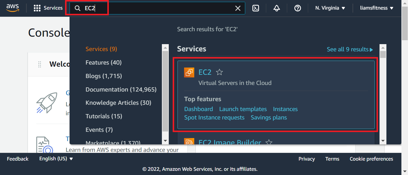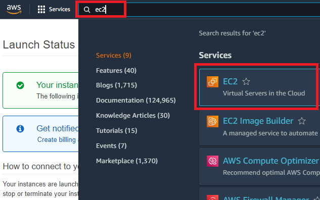 Now we can proceed to create our instance, enter EC2 in the search bar and select the 1st EC2 listing.