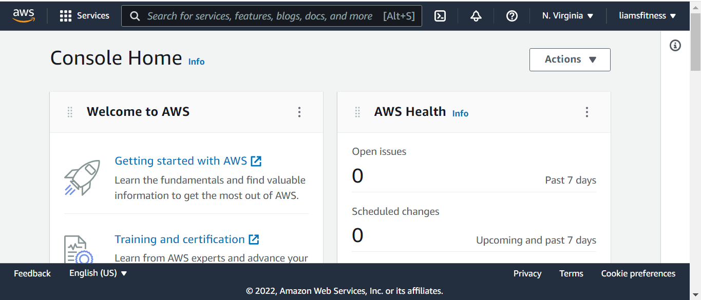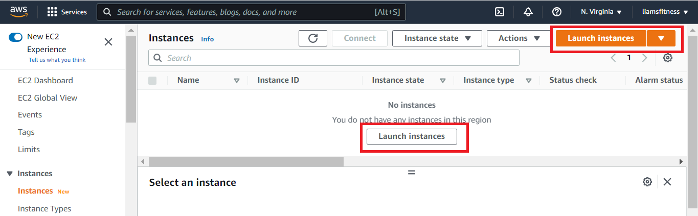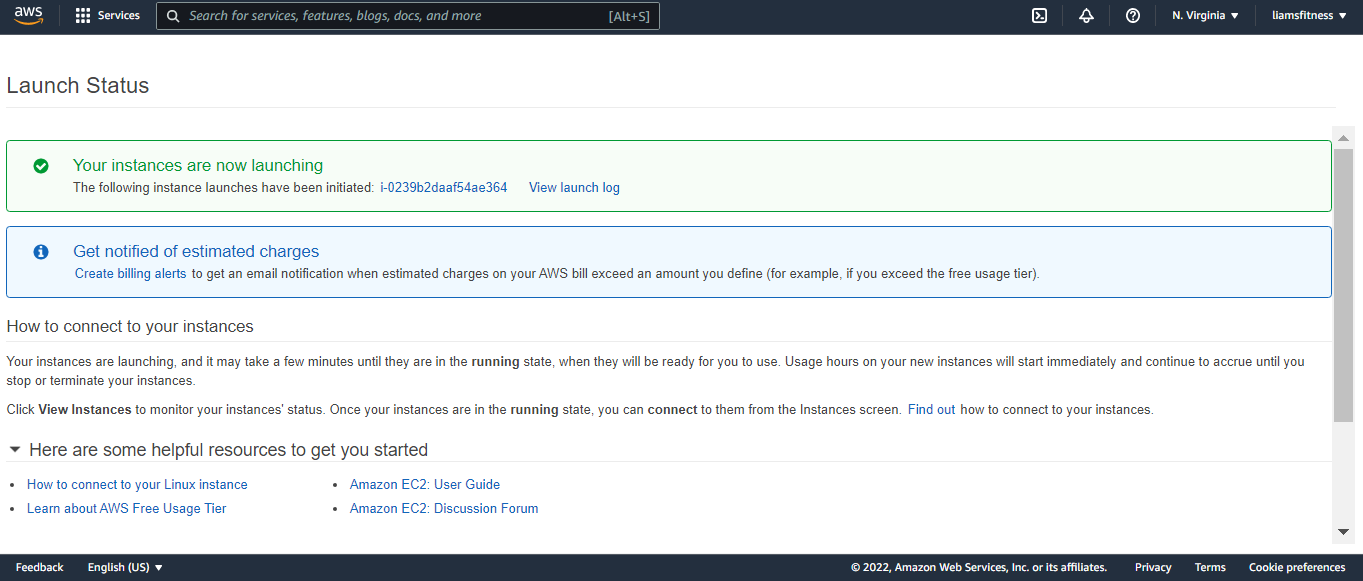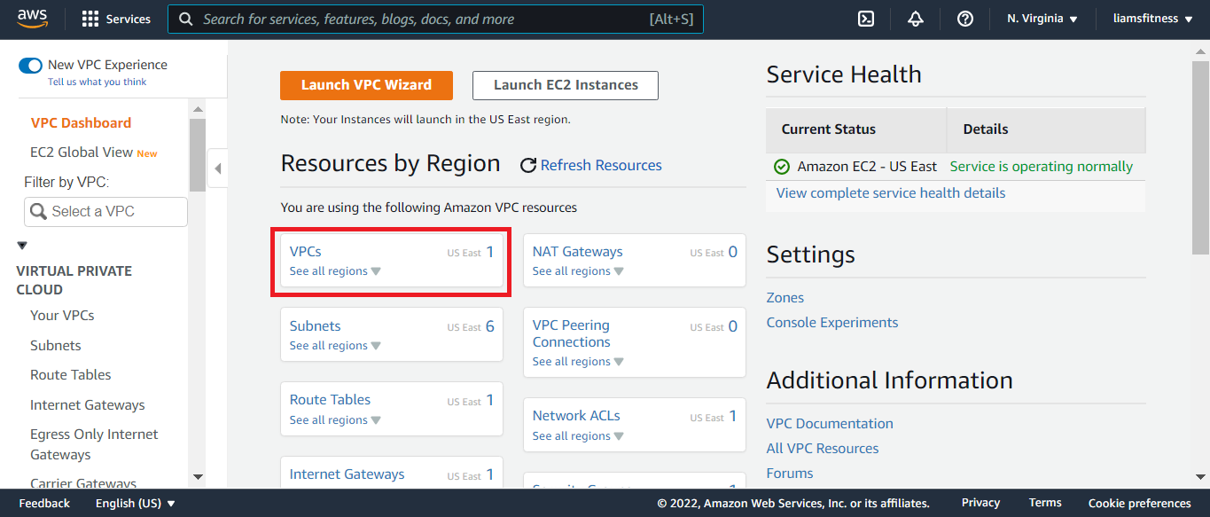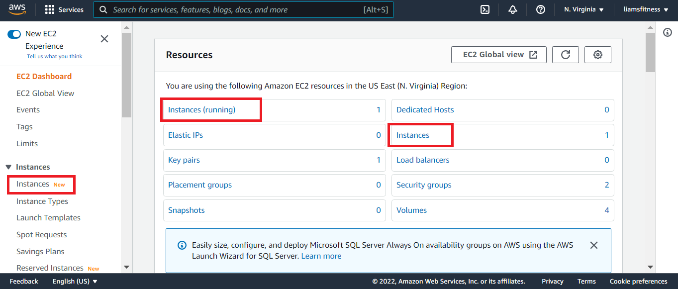 You will be brought to the EC2 Dashboard. It contains links to the resources being used in the selected AWS region. In my case it's US East (N. Virginia).