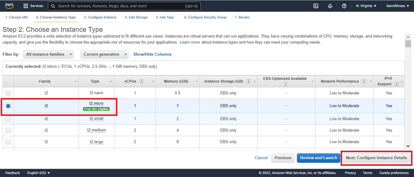 In the second step, we choose the instance type. Since we want a free instance, select t2.micro and
