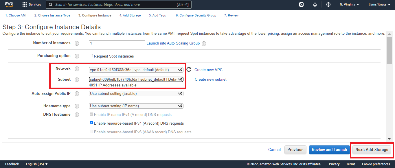 The third step allows us to select the VPC (vpc_default) and subnet (subnet_default) that we named earlier. After making those changes, click Next: Add Storage.