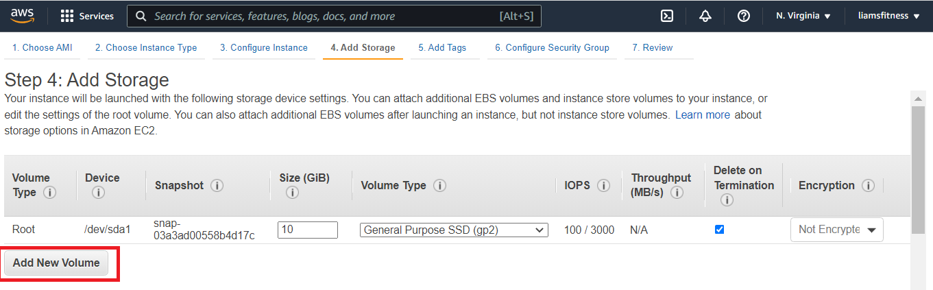 After clicking the Add New Volume button, I set the size to 1GB and checked Delete on Termination.
