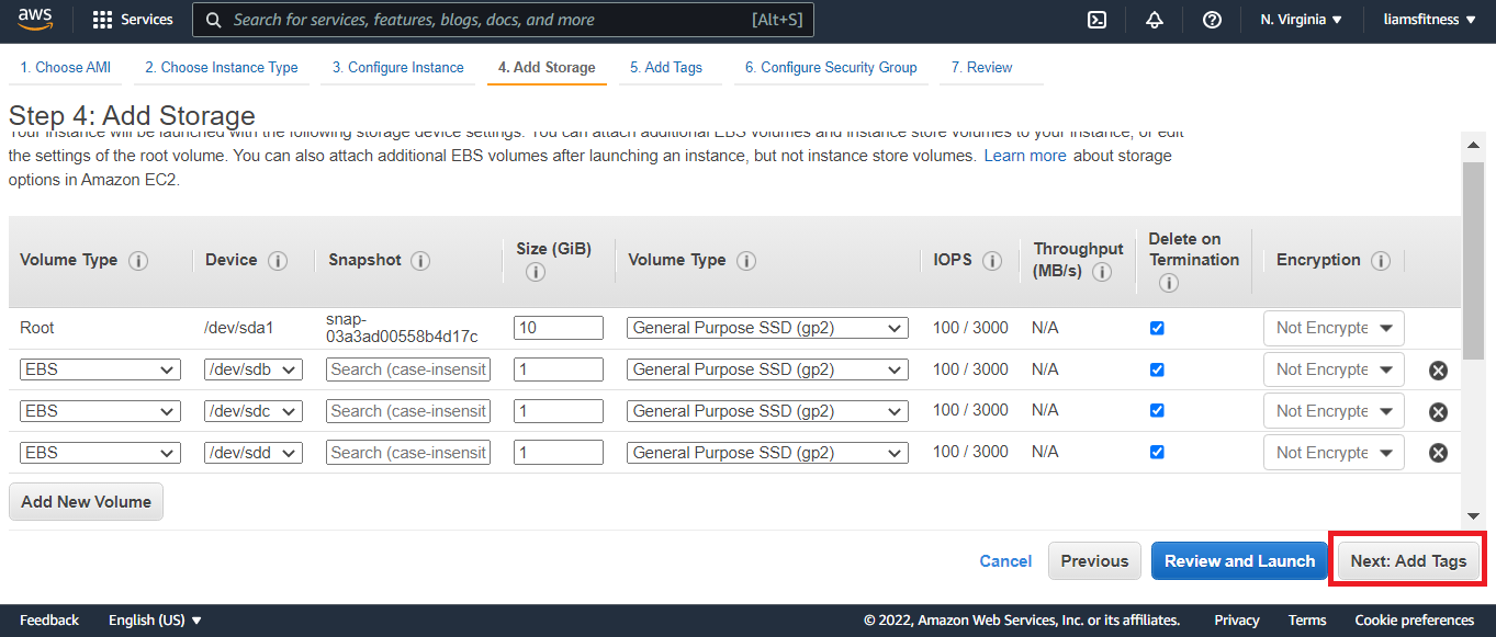 I repeated these steps 3 times total. After setting the storage, click Next: Add Tags.