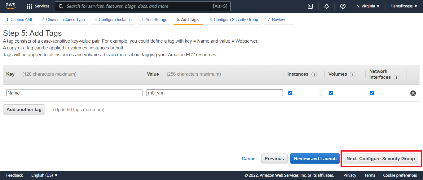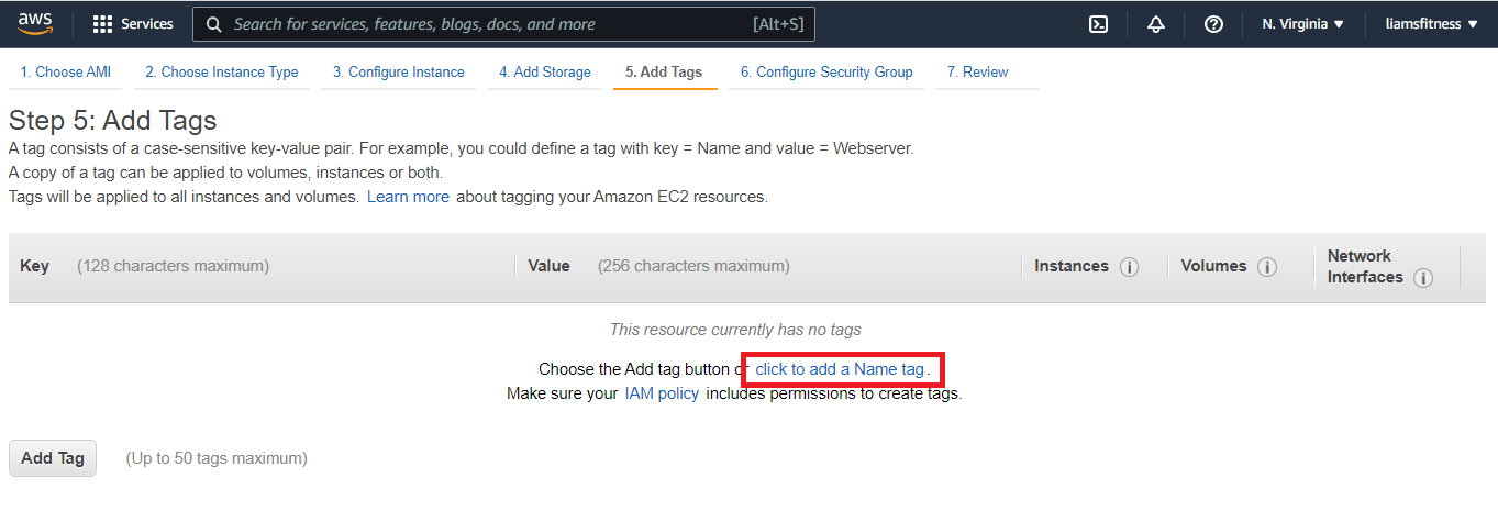 The fifth step allows us to tag our instance. Tagging helps categorize our resources. We will keep it simple by adding a name tag. To do this click the click to add a Name tag link and set the name to whatever you desire.