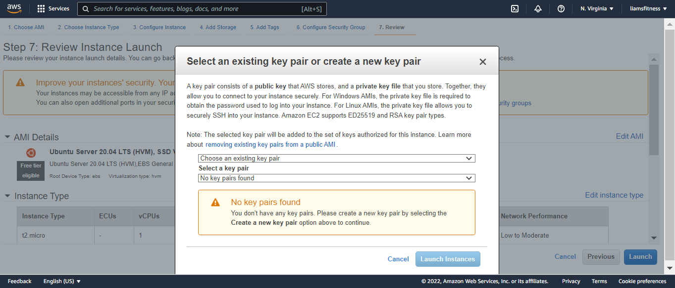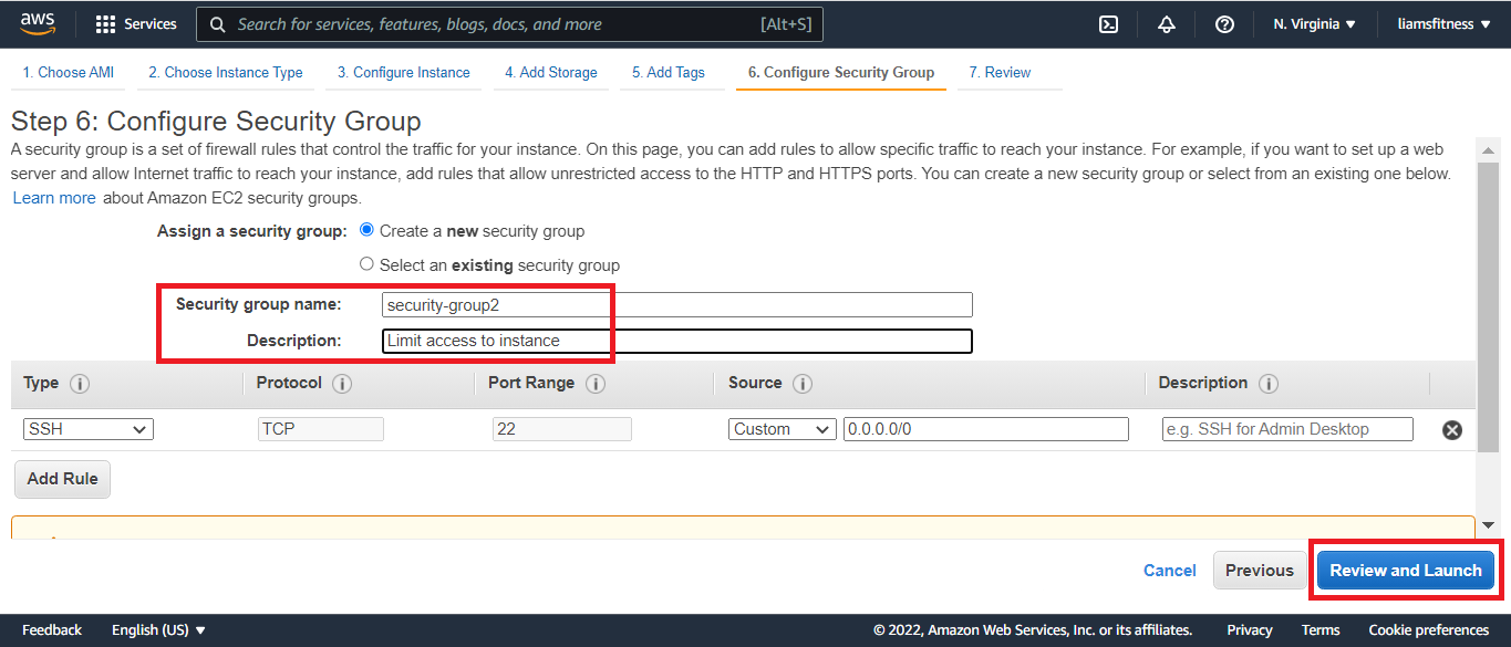 Note that only port 22 is open and that we are only allowing SSH connections to our instance. I also provided a