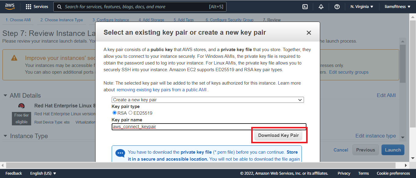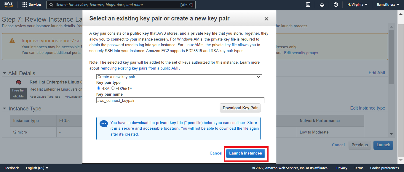 After you download the key pair (aws_connect_keypair.pem), you will be able to click Launch Instances to bring up RHEL 8.