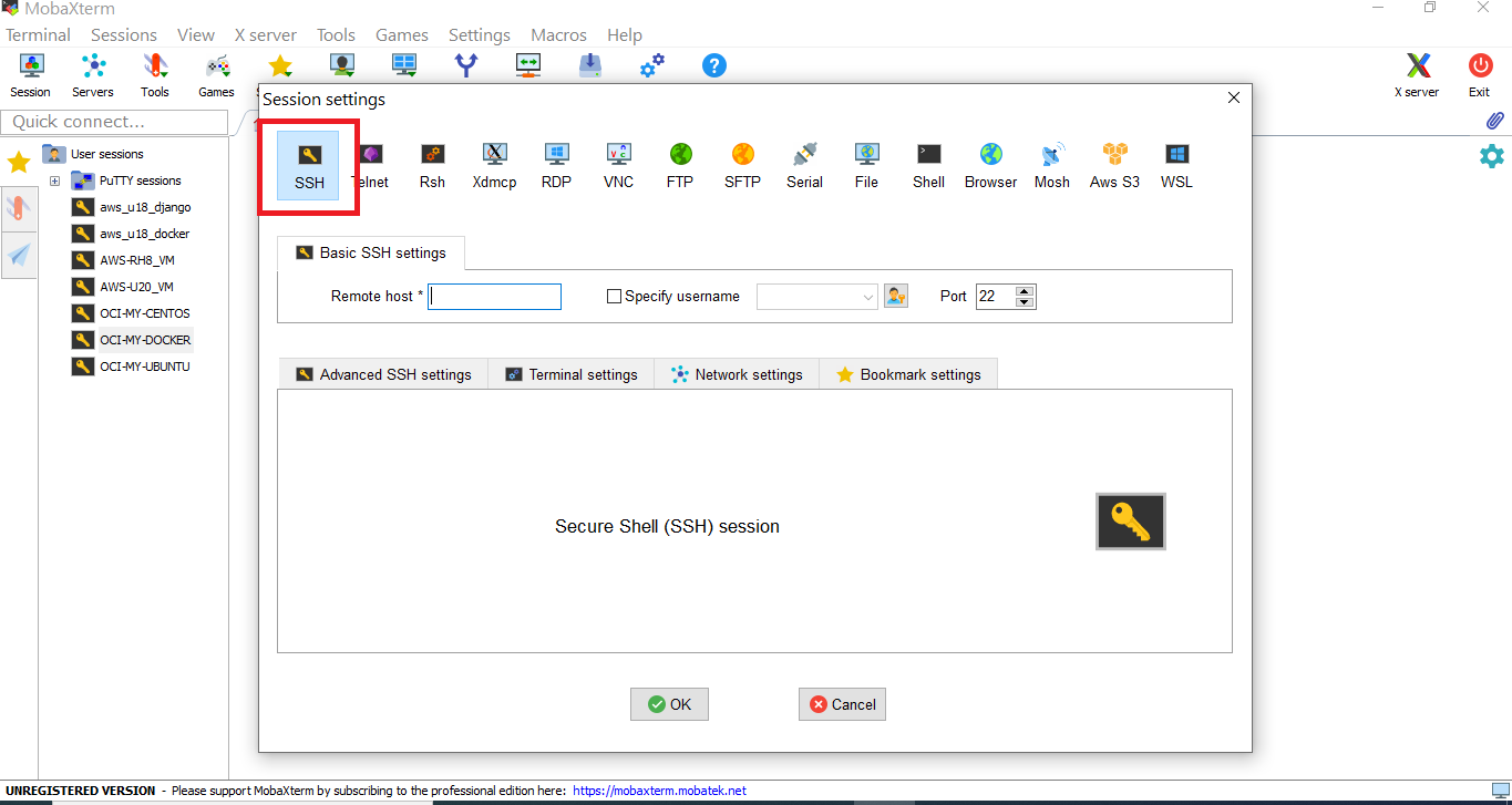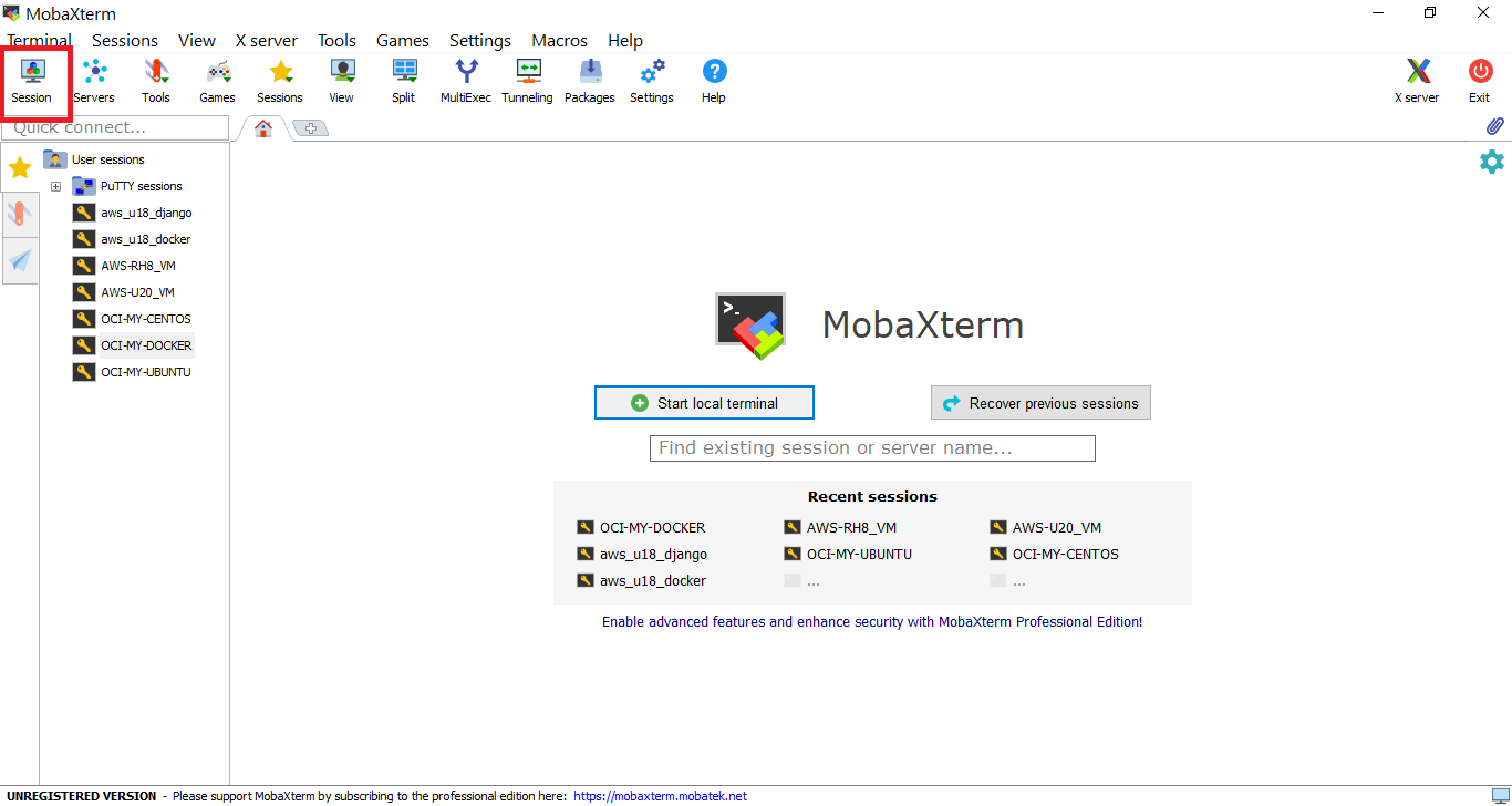 Using MobaXterm, I would first create a session by clicking the Session button in the top left corner: