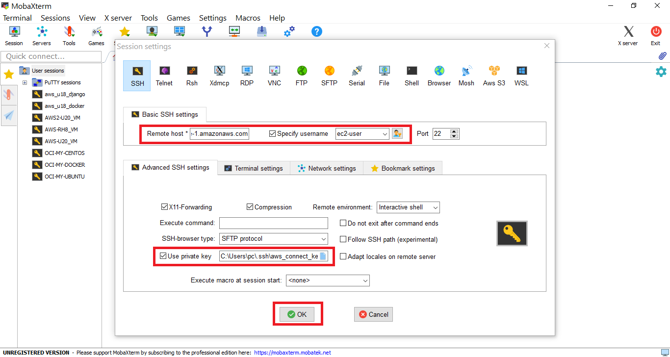 Then, under Advanced SSH Settings select the key that you downloaded earlier (aws_connect_keypair.pem). Finally, click OK.