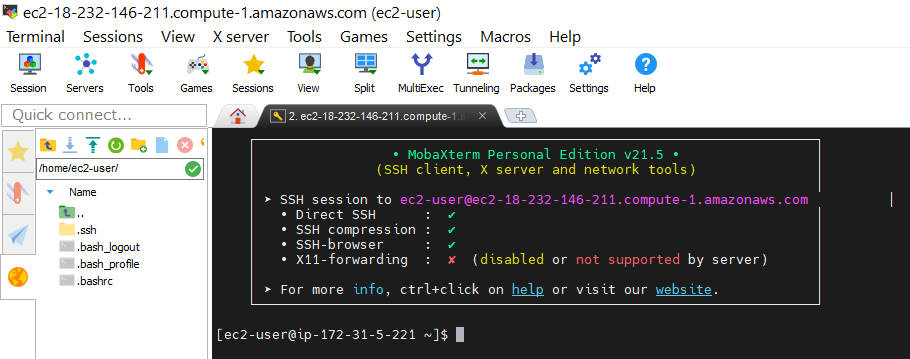 Now you will need an SSH client to connect to your instance. I am on Windows 10 and have installed GitBash which includes an SSH client. If you do not want to install GitBash, I also use MobaXterm Portable. It's a great tool and easy to use.