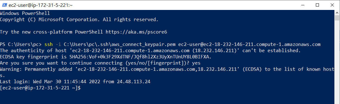 ssh -i C:\Users\pc\.ssh\aws_connect_keypair.pem ec2-user@ec2-3-231-211-145.compute-1.amazonaws.com