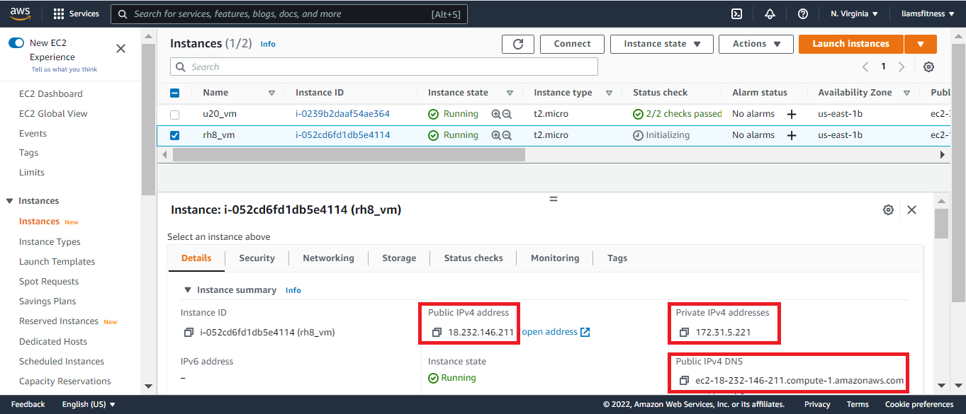 Ensure your new instance is selected (rh8_vm), then on the Details tab, note the value for Public IPv4 DNS. I usually keep the instance's name, public IP, private IP and public IPv4 DNS stored for easy access. We will need this to connect to the instance.
