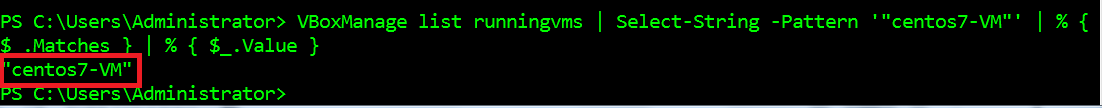 $vm = (VBoxManage list runningvms | Select-String -Pattern '"centos7-VM"' | % { $_.Matches } |