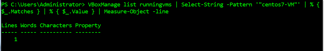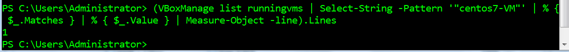 $vm = VBoxManage list runningvms | Select-String -Pattern '"centos7-VM"' | % { $_.Matches } | % { $_.Value } | Measure-Object -line