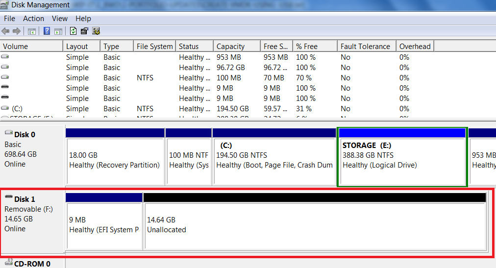 Look for your USB drive in the Disk Management window and note its disk number. In my case, it's Disk 1.