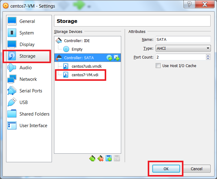 Please note that, under Controller: SATA, the .vmdk file (centos7usb.vmdk) pointing to the bootable USB MUST be first in the list, followed by the virtual hard disk (centos7-VM.vdi) being used as the CentOS 7 install location.