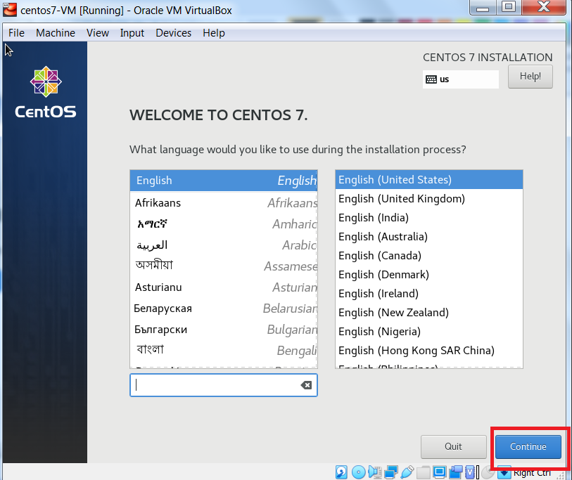 Next, navigate up to Install Cent0S 7 and, on your physical keyboard, hit the Enter key to begin the installation.