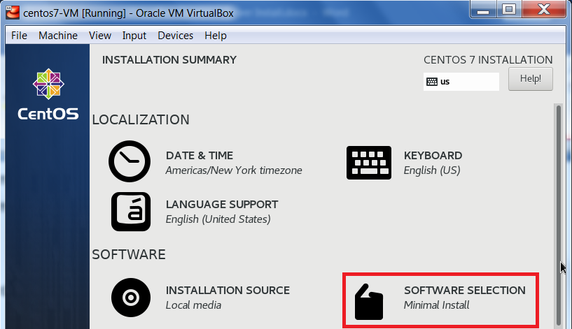 Since we are using a CentOS 7 minimal ISO image, the Software Selection is set to Minimal Install.