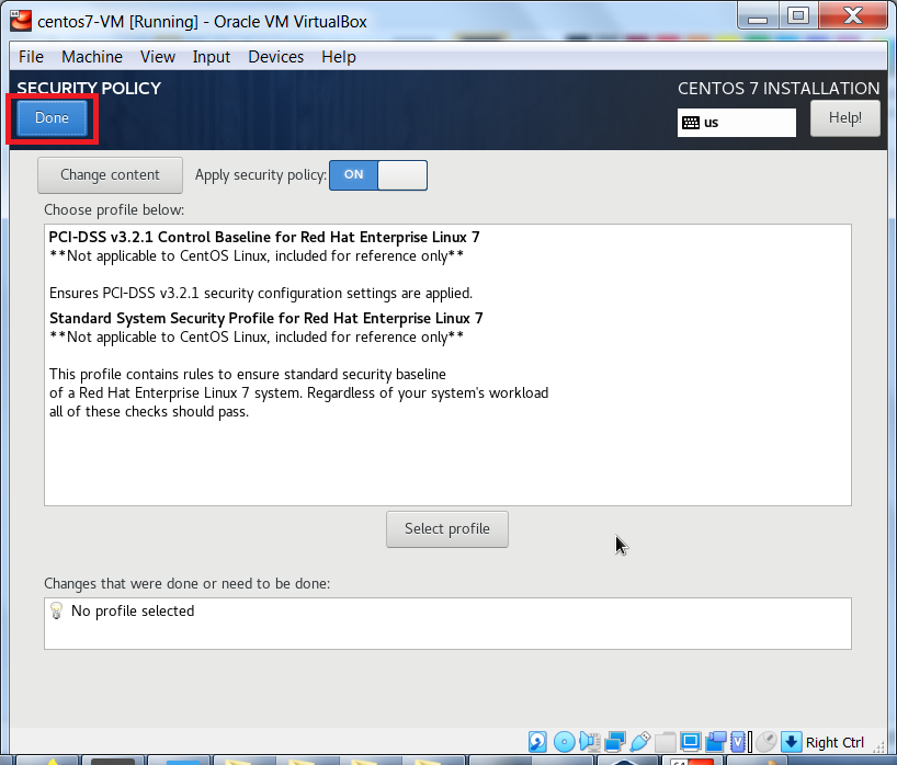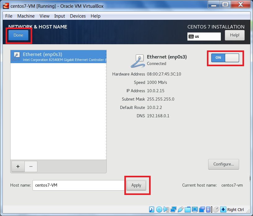 Second, enter the host name. To keep it simple, I entered centos7-VM and clicked Apply. Finally, click Done.