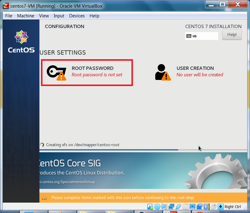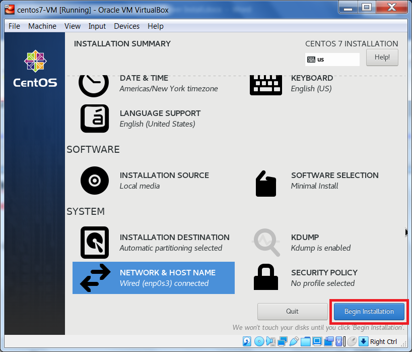 We are now ready to begin the installation of CentOS 7. Click Begin Installation
