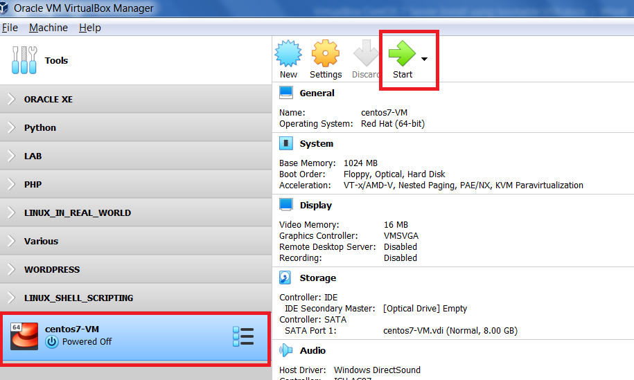 From the VirtualBox Manager interface, ensure your new VM is selected and click Start