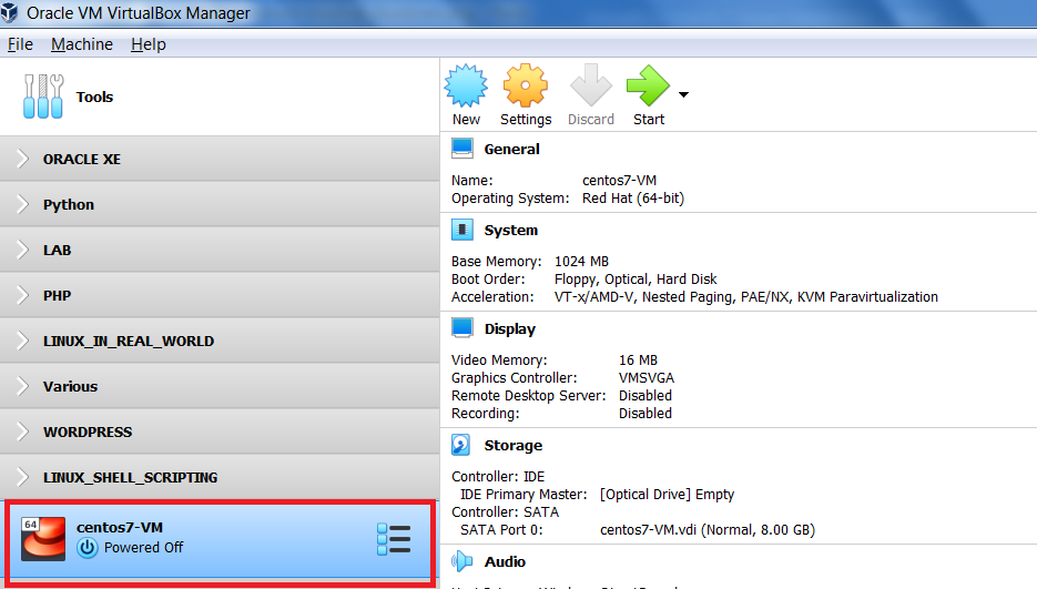 Now we will need to add a virtual hard disk to act as our CentOS 7 installation location. To create a new virtual hard disk, from the VirtualBox Manager, ensure your VM is selected and click Settings