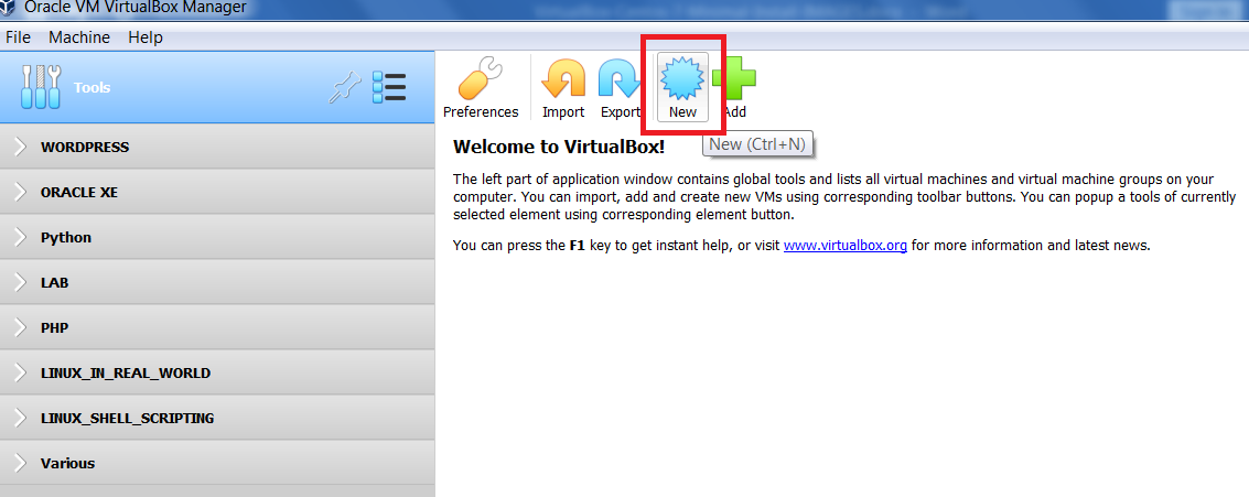 Next, start VirtualBox and on the VirtualBox Manager interface, click the New button to start the creation of a new virtual machine.