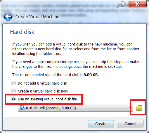 Ensure Use an existing virtual hard disk file is selected and click the browse icon to the right
