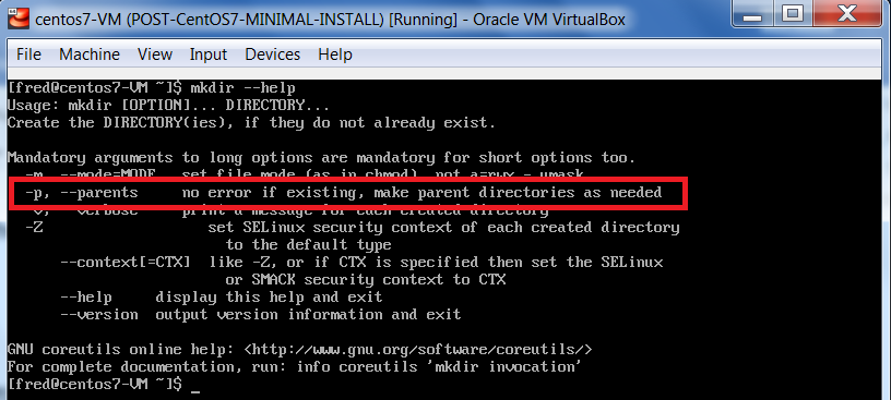 What If we need to create a multi-level directory structure, such as parent_dir4/child_dir1/mini_dir1, without having to execute three separate mkdir commands. Is that possible? Let’s first check to see if any help is available to us by executing: