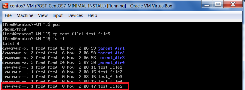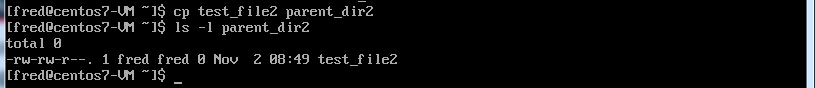 The copy operation was a success. Next, we will copy a file from our home directory to one of our empty directories. Execute the following: