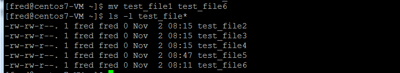 We successfully renamed a file. Note my use of the asterisk '*' wildcard character in my directory listing. In this instance, the '*' wildcard represents zero or more characters. Any file that begins with test_file will be returned in the results.