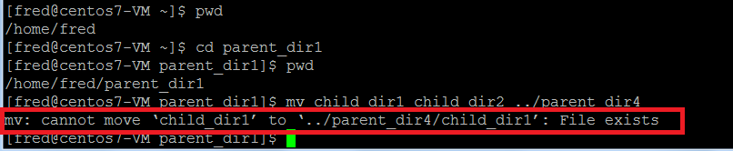 You will notice that both directories contain a child_dir1 directory. To perform the directory move operation, ensure you are in your home directory (cd if need be) and execute the following: