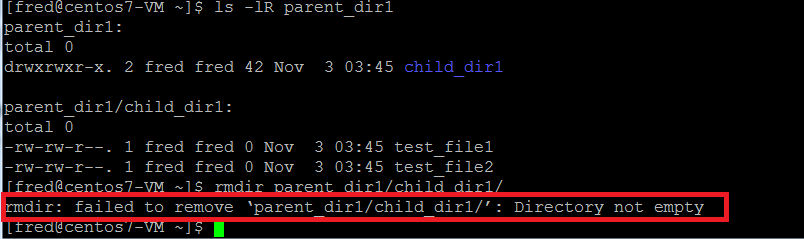 $ rmdir parent_dir1/child_dir1 // attempt to delete non-empty directory