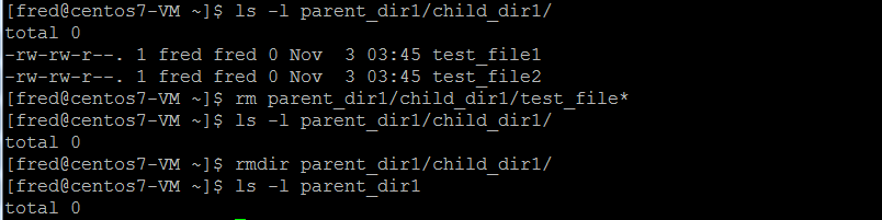 $ rm -fR parent_dir4 // delete (remove) directory and its contents
