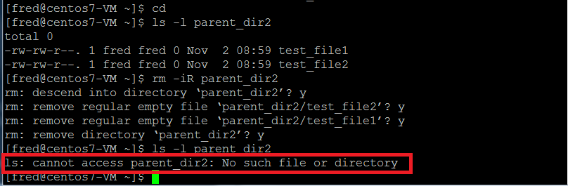 $ rm -iR parent_dir2 // delete (remove) directory and its contents interactively