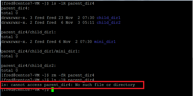 $ ls -lR parent_dir4 // verify directory successfully deleted