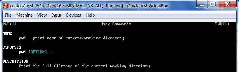 You can use 'man command_name' to get a full listing of helpful information for a specific command. For example, if we wanted to get information on the pwd command, we would execute:$ man pwd